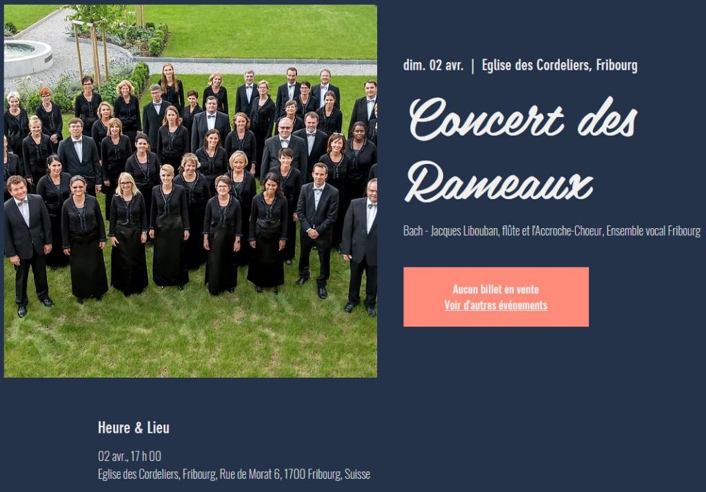 Le 2 avril 2023 à Fribourg. Nous avons eu le plaisir d’interpréter avec l’Orchestre des jeunes Fribourg, des solistes et sous la direction de Jean-Claude Fasel, la cantate « Weinen, Klagen, Sorgen, Zagen » (BWV 12). Johann Sebastian Bach écrivit cette cantate, l’une des premières œuvres de la période de Weimar, pour le troisième dimanche après Pâques – le jubilate. Le premier chœur est si efficace dans son effet tragique que Bach a réutilisé une grande partie de cette musique pour le « Crucifixus », la partie centrale et cruciale du Credo de sa Messe en si mineur.